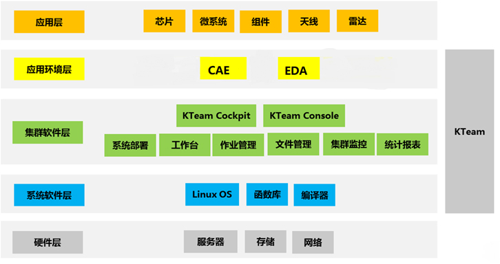 KTeam是基爾科技自主研發的高性能協同設計仿真軟件平臺,可實現設計與計算集群資源統一部署、使用、瀏覽、管理、監控和統計等,可大幅提高仿真效率,簡化平臺管理。KTeam由應用工作臺、作業調度模塊、文件管理模塊、集群監控模塊、資源統計模塊組成。選用KTeam及其相關服務,可以幫助用戶部署操作系統,安裝和測試集群軟件以及應用環境,基于高性能集群硬件設備,提供傳統的設計環境和高速的仿真體驗。